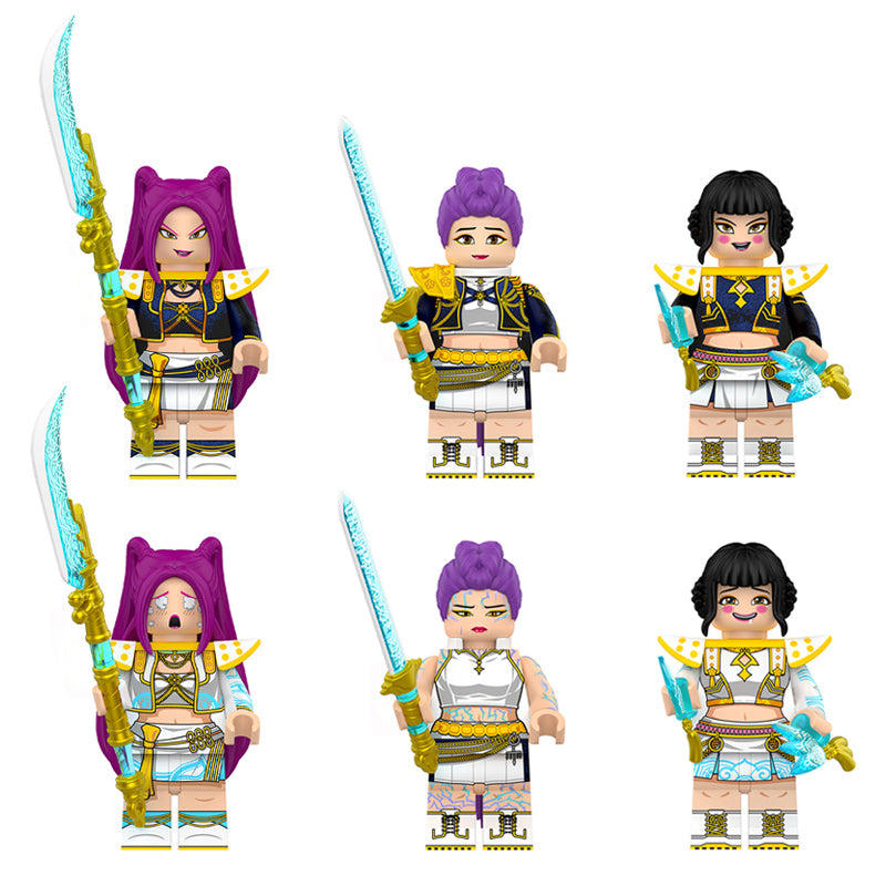 These LEGO-compatible brick minifigures feature premium printing, expressive alternate faces, and uniquely sculpted weapons inspired by K-pop performance fashion fused with demon-hunting fantasy aesthetics.